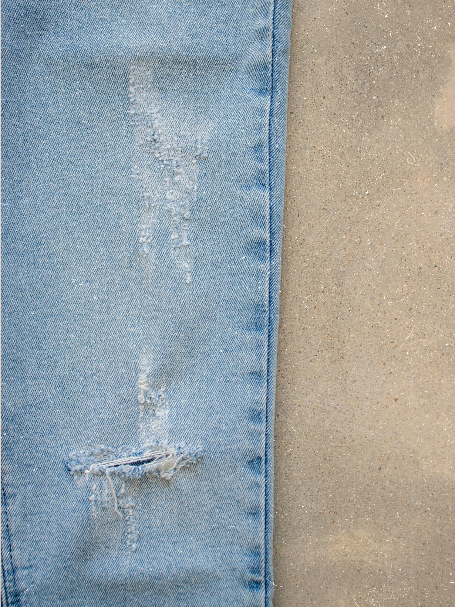 • For colored garments, the distressed effect may cause some color loss with washes.