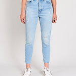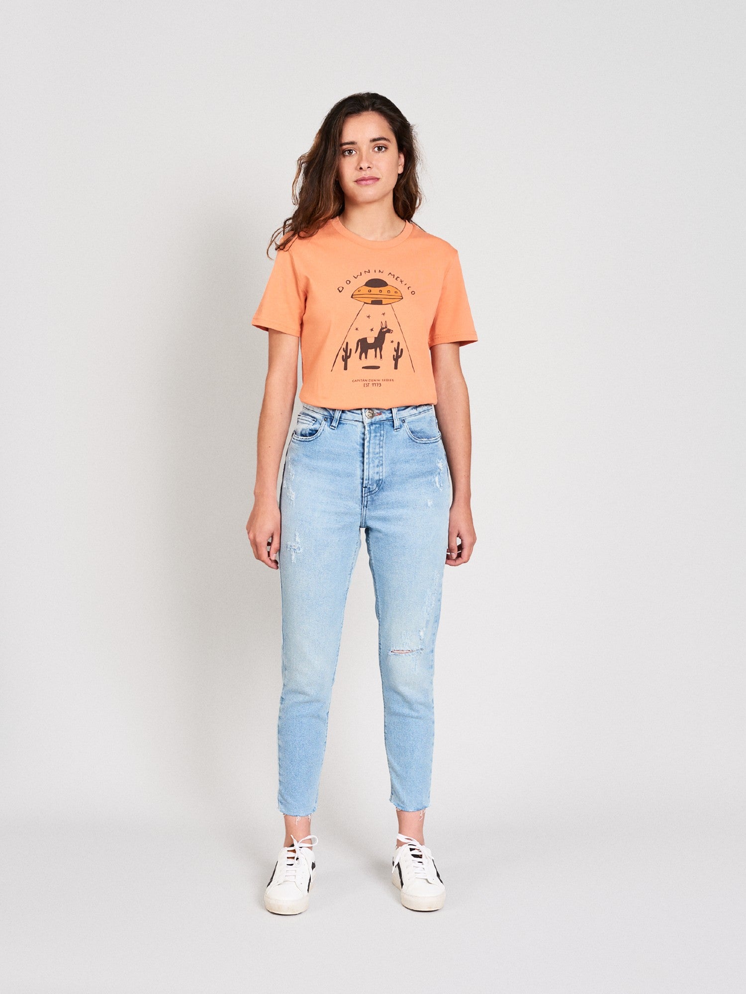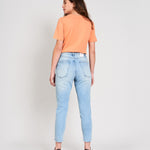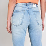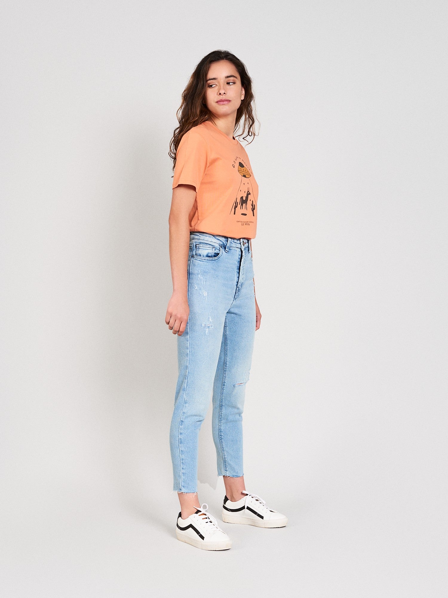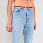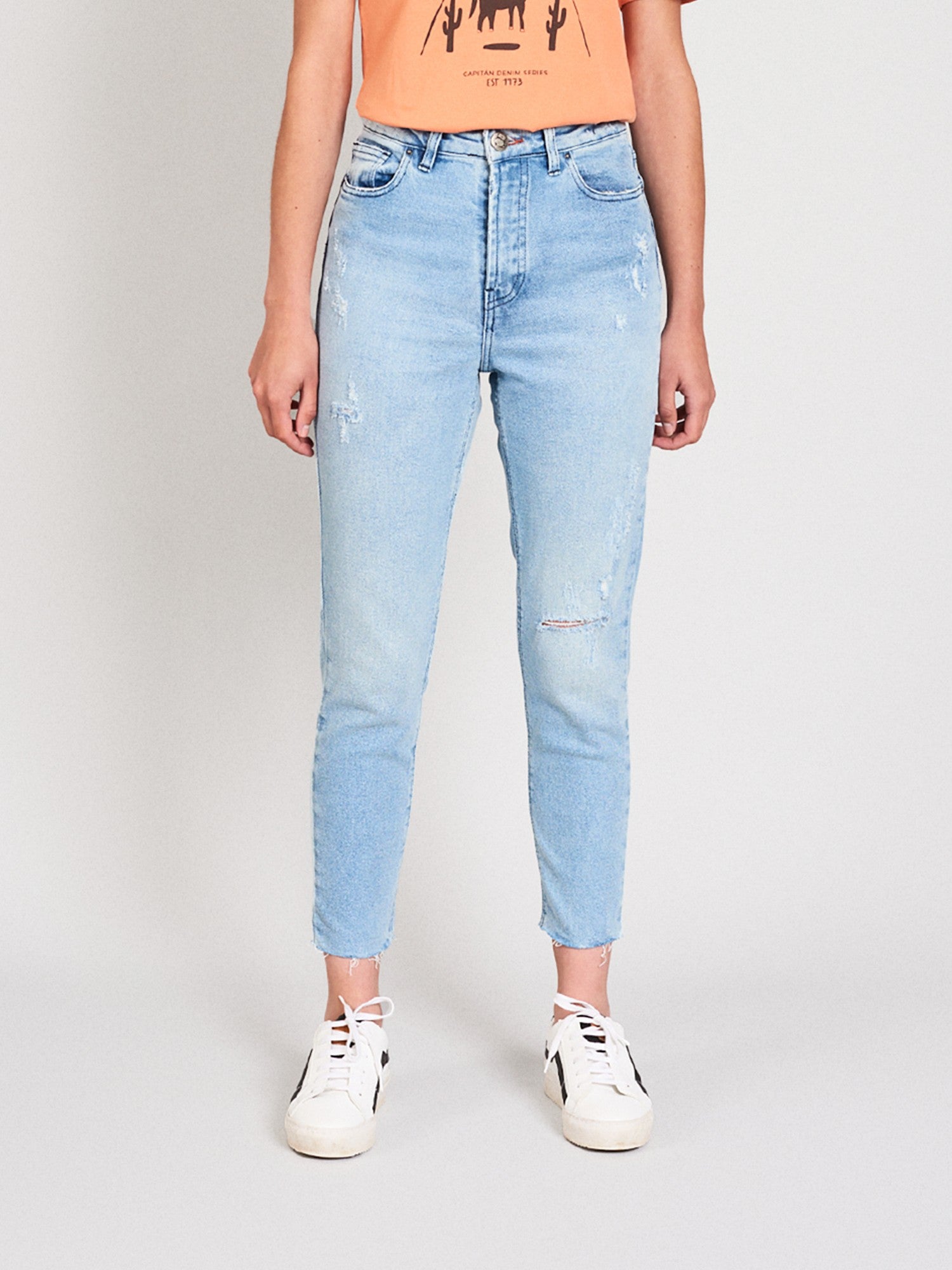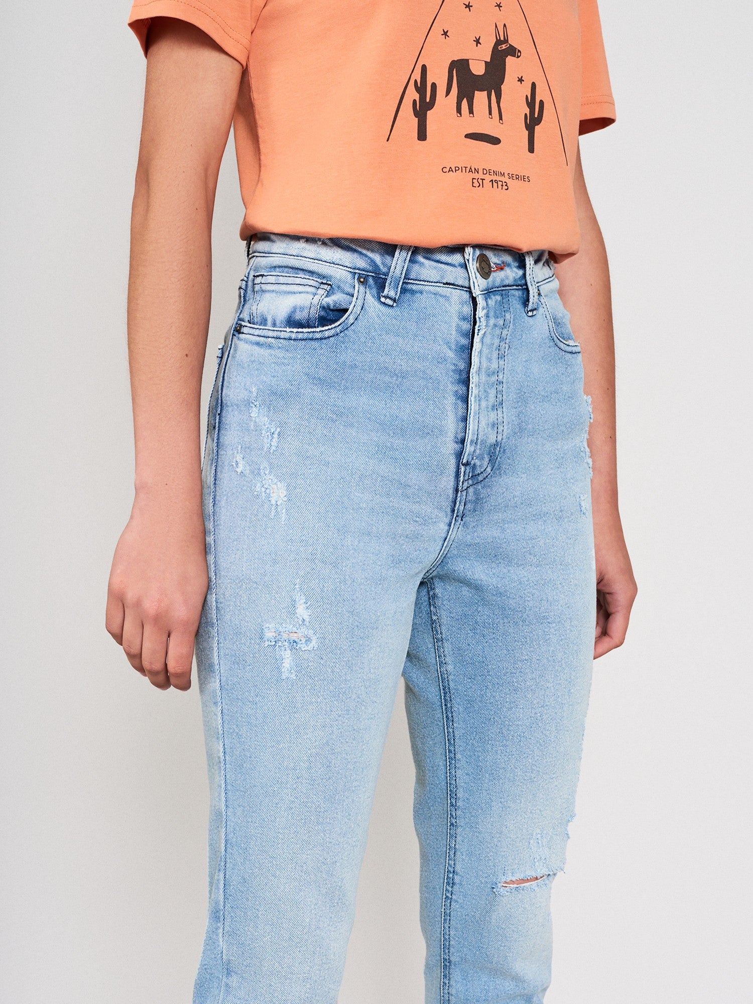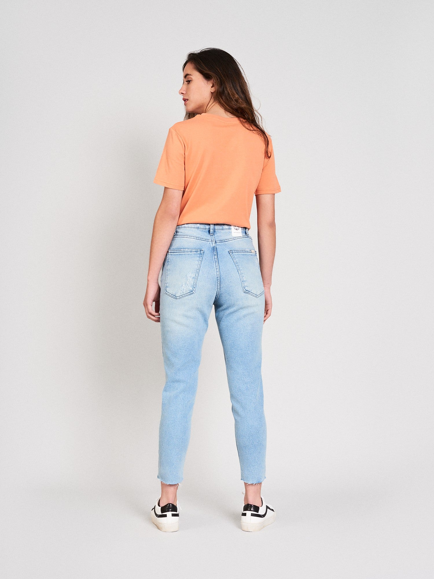 Momfit high-waisted jeans with wear and ripped hem. Made in Spain in a sustainable way.