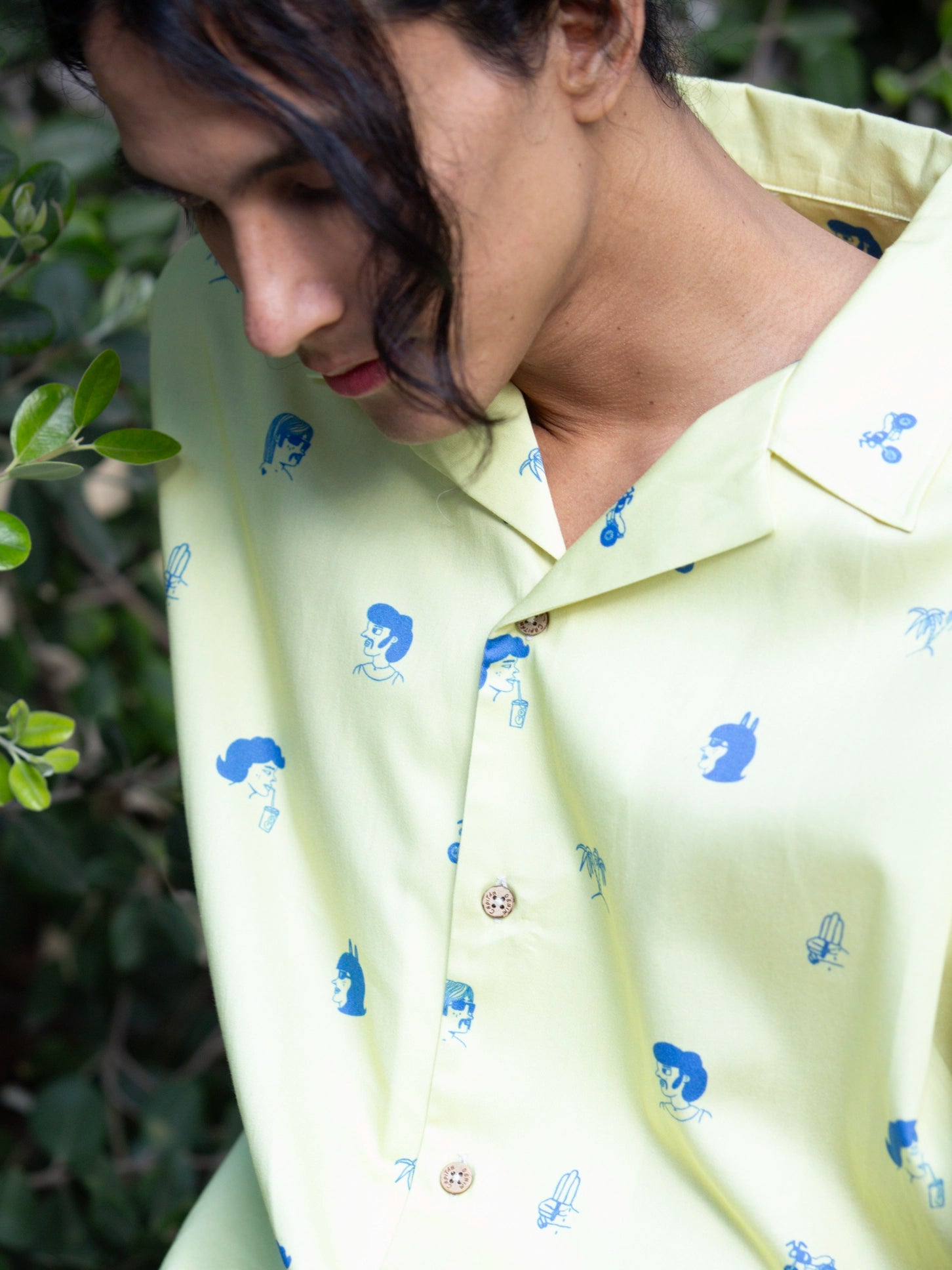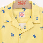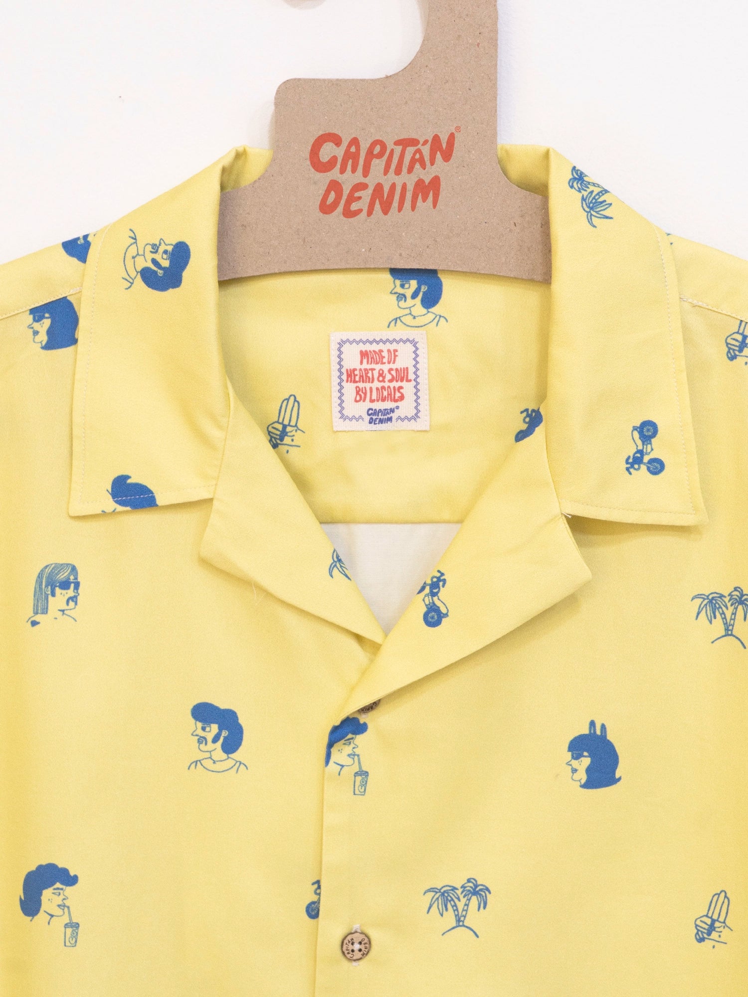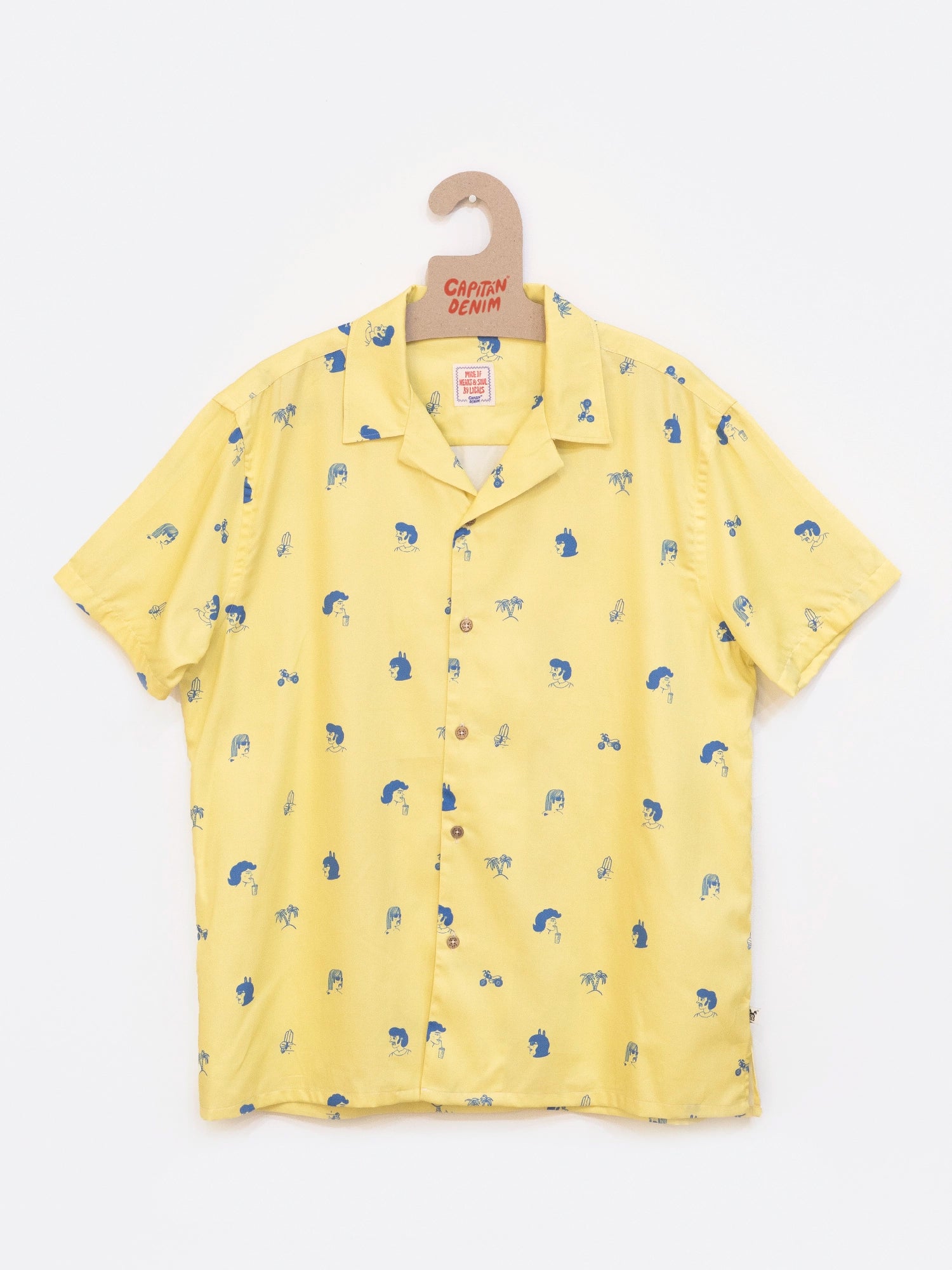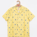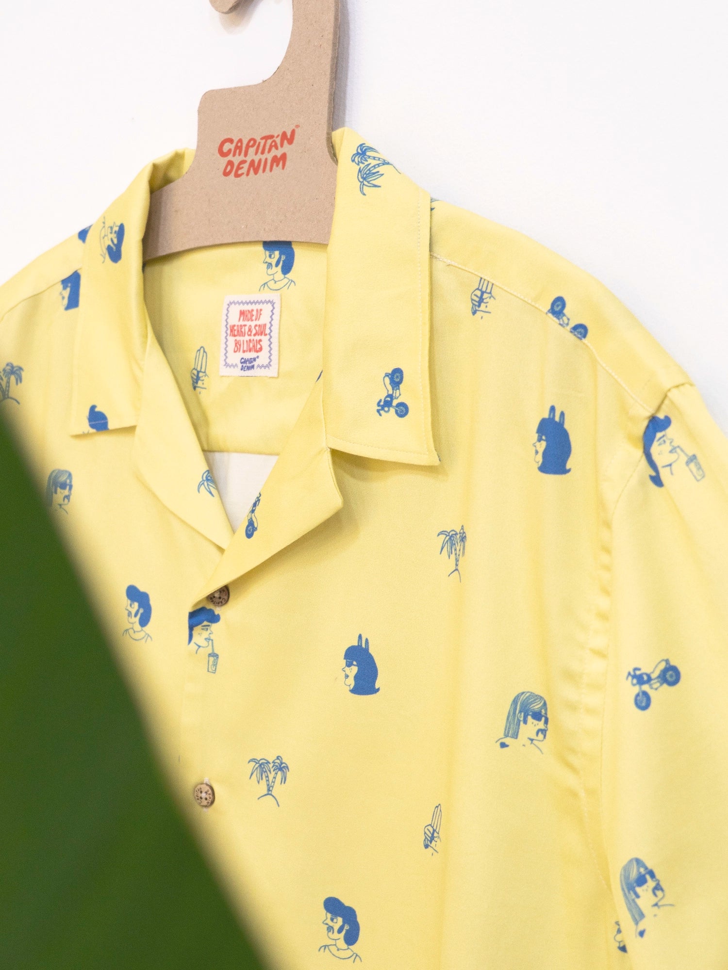 The Calypso Yellow Summer Shirt is a burst of summer in one piece. With a yellow background and blue prints of palm trees, milkshakes, ice cream, and vintage motorcycles, this shirt captures the season's fun spirit.