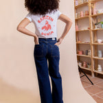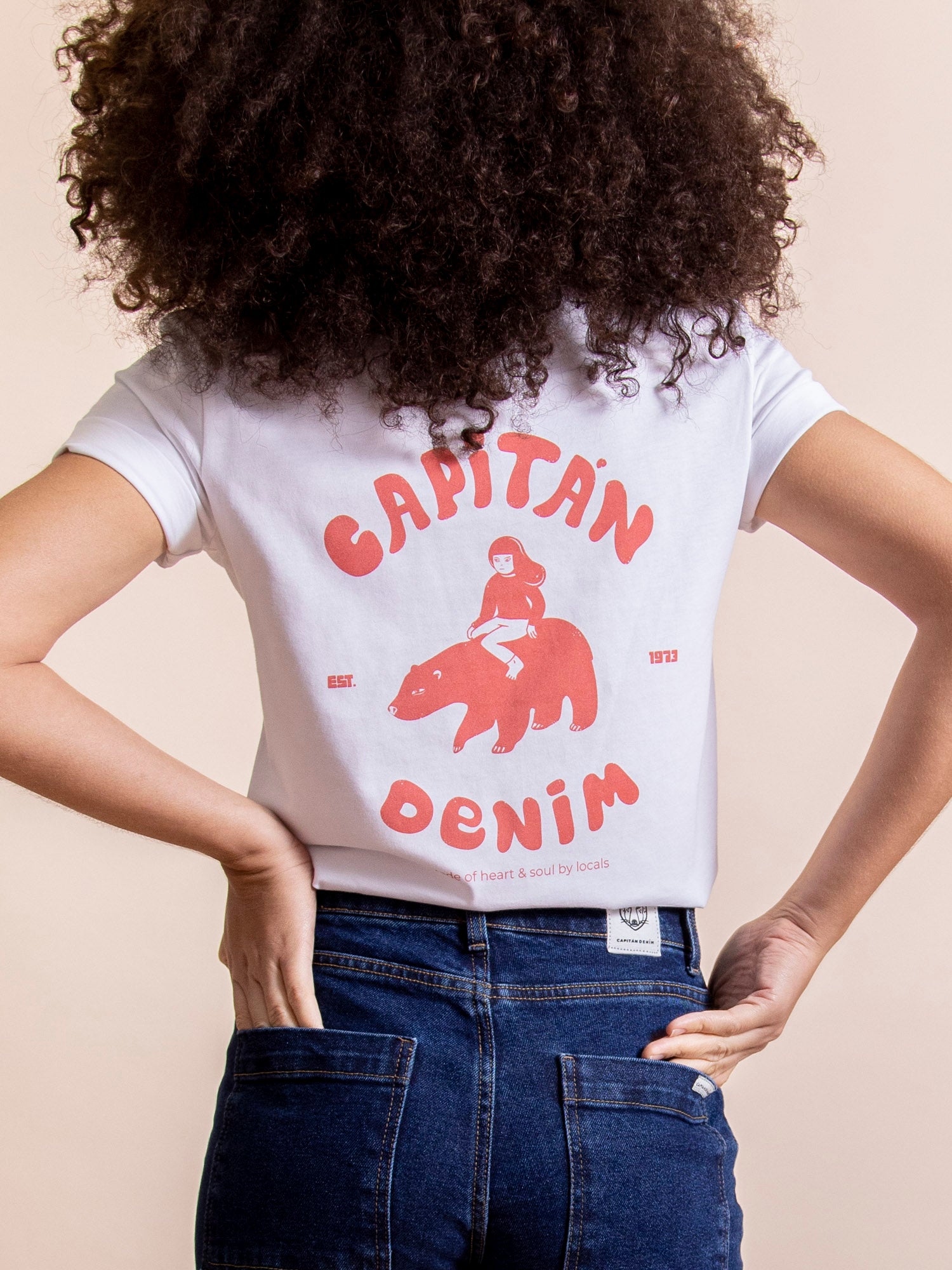 White sustainable unisex t-shirt with one of our latest embroidery unisex short sleeves is 100% organic cotton are exclusive designs. It is unisex, so you can share it with whoever you want. Being made from a sustainable fabric, you will differentiate it for its softness and comfort. Designed by local artists, making it exclusive to Captain Denim. Perfect for summer!