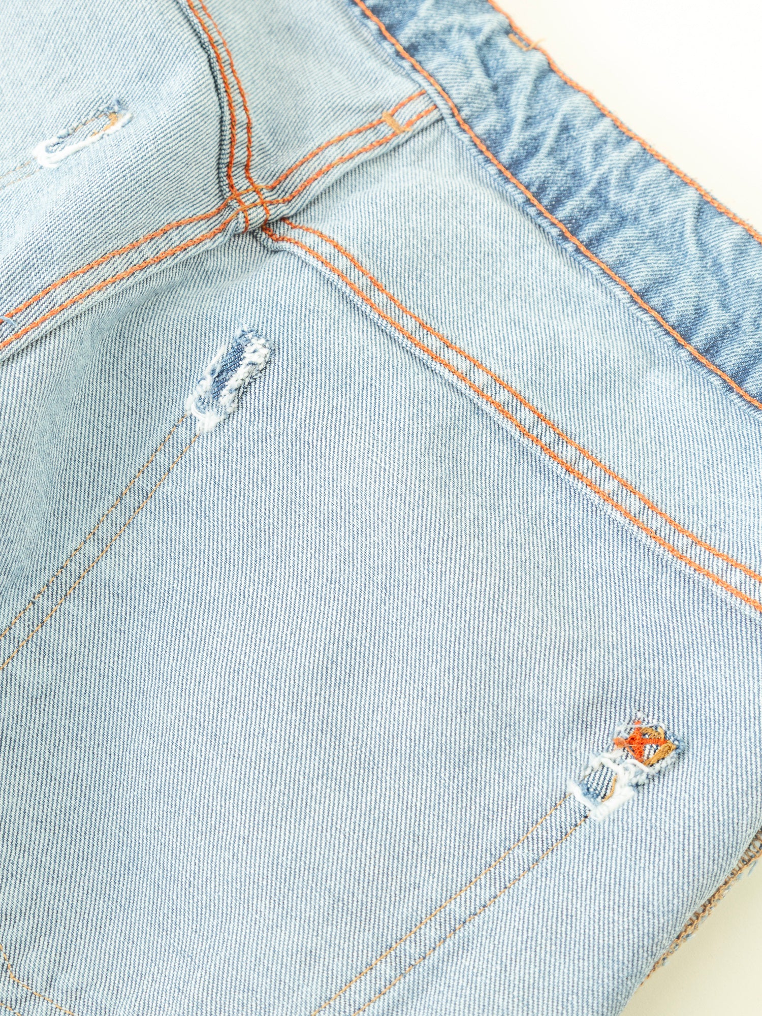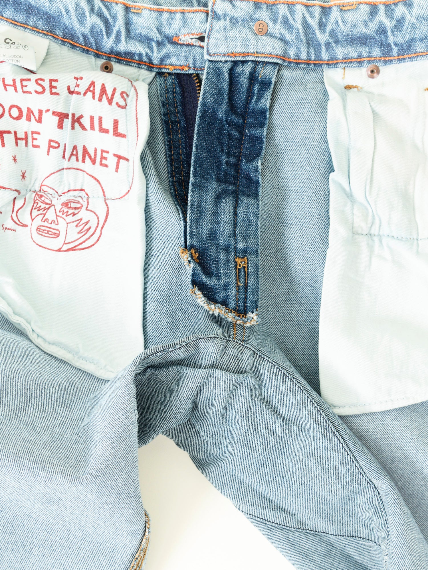 Remember to always wash it inside out, with the zipper, the button closed, with cold water and less than 30ºC. We recommend using neutral soap and keeping it in the compartment. Colored pants with a worn effect may lose some color after washing.