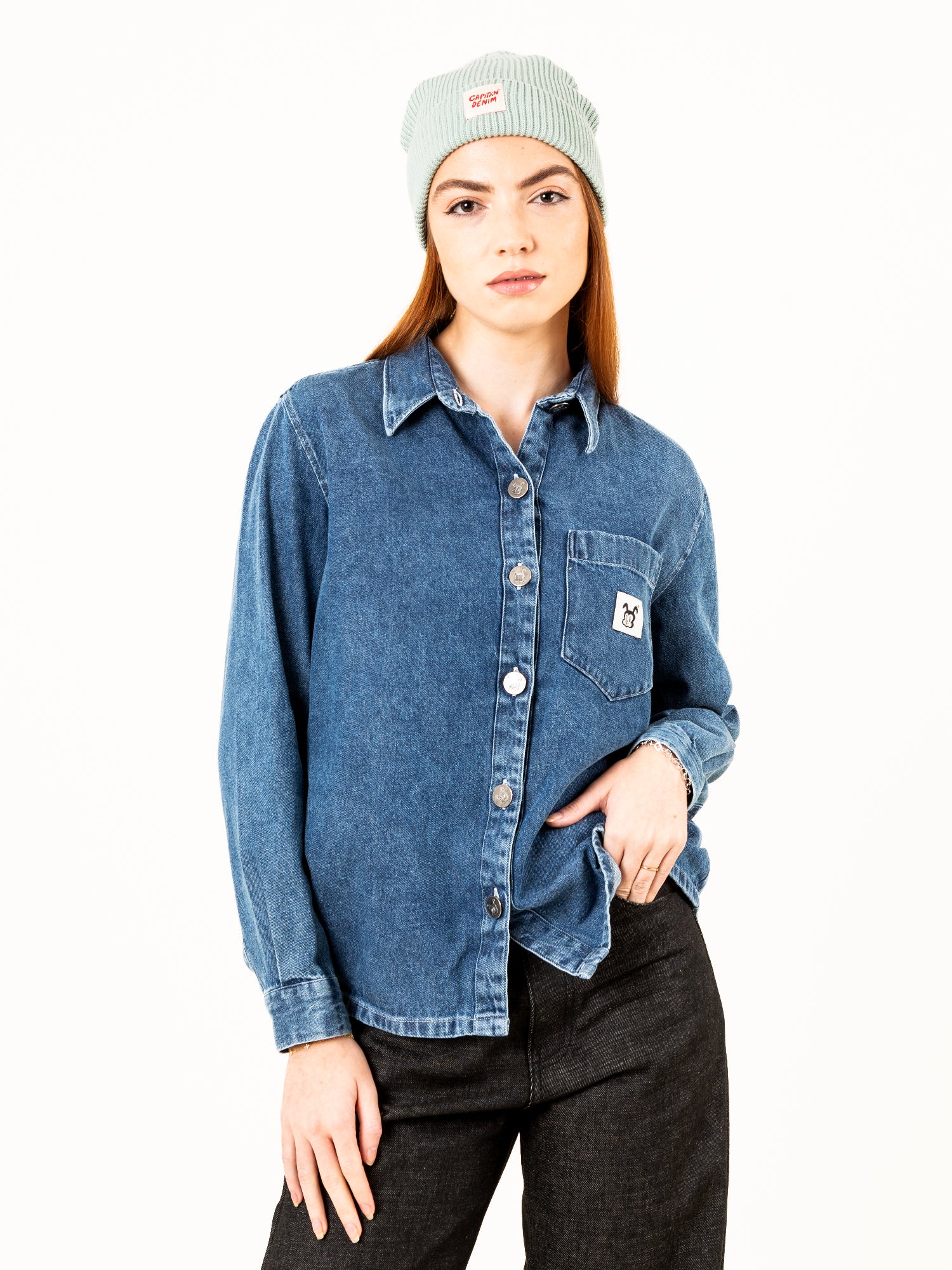 • Bolsillo delantero con parche Capitán Denim.