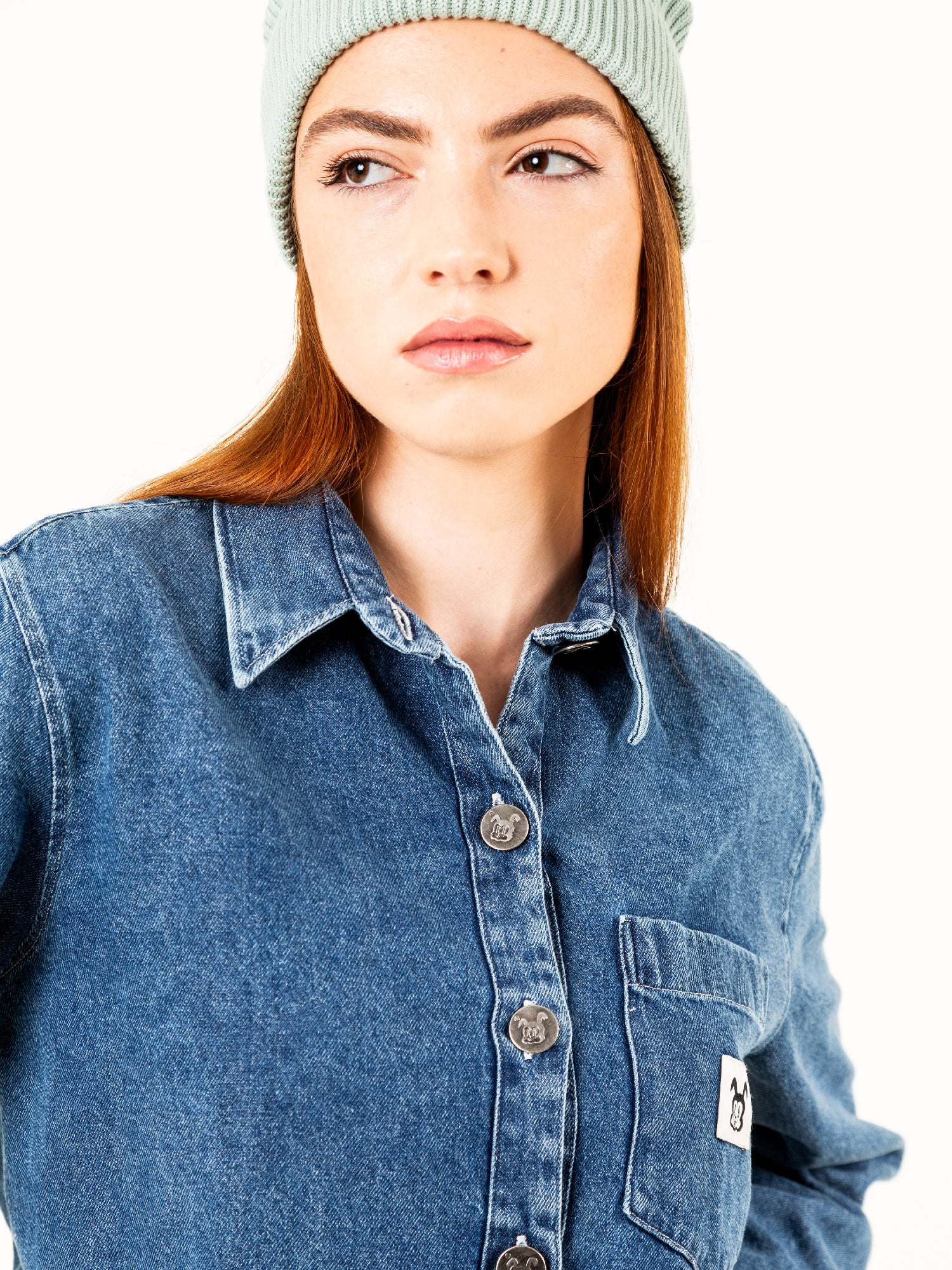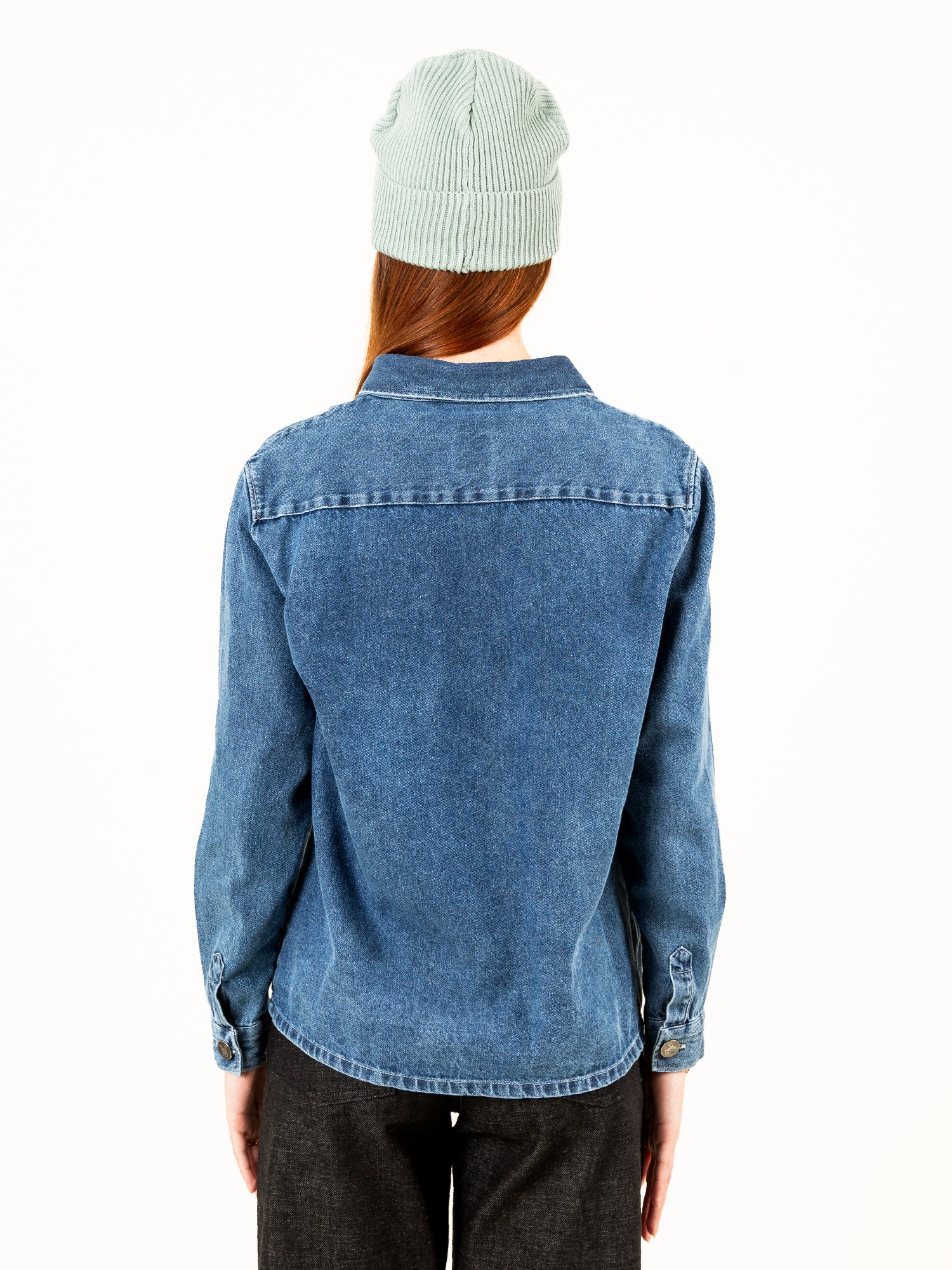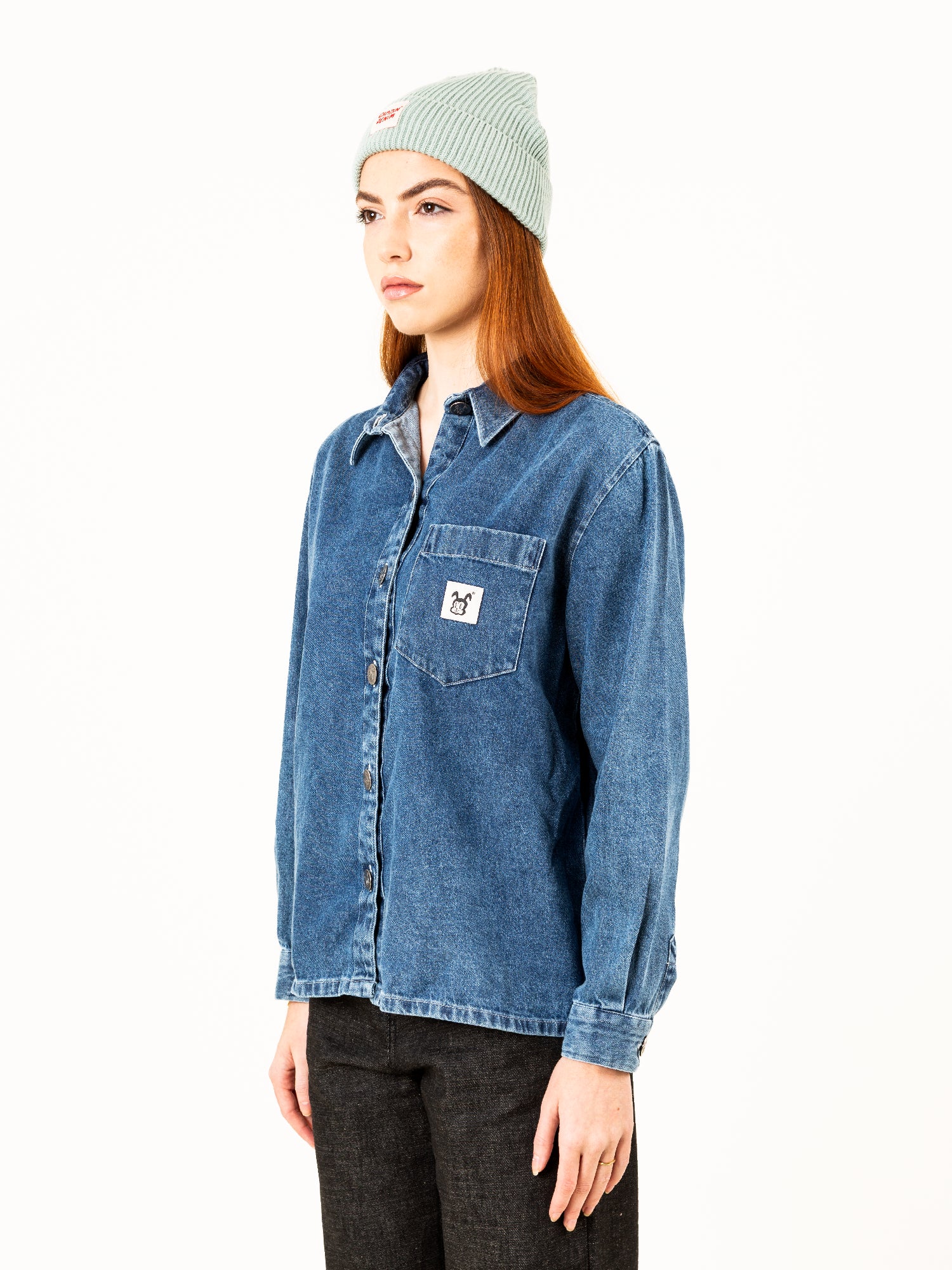 Hecha en 100% algodón, destaca por su tejido denim suave al tacto y su tono azul lavado con efecto vintage.