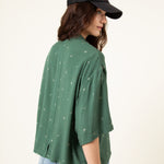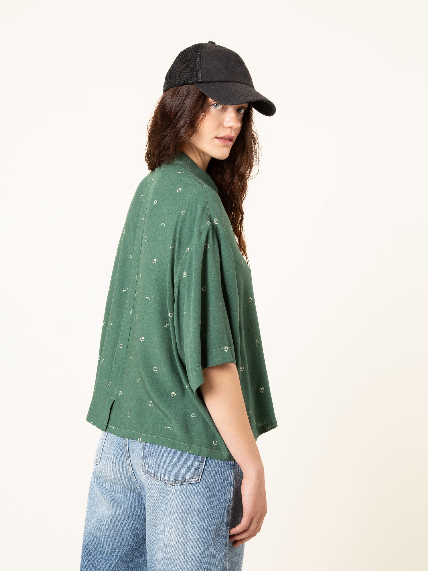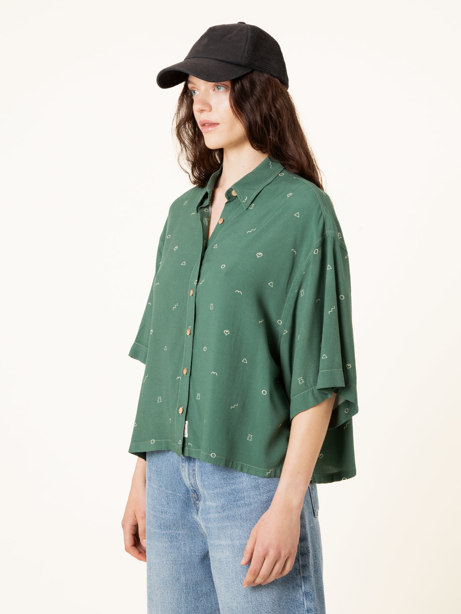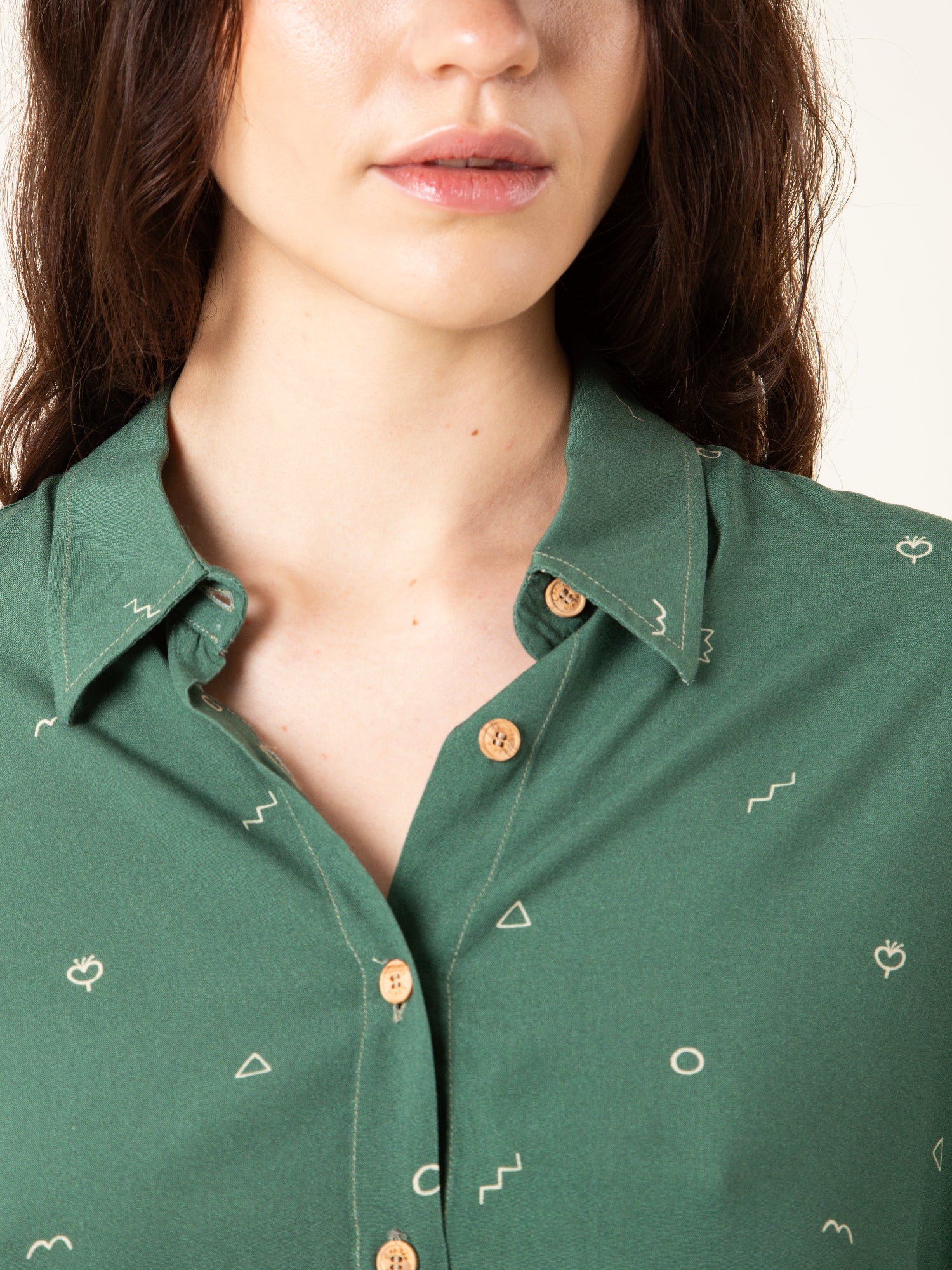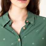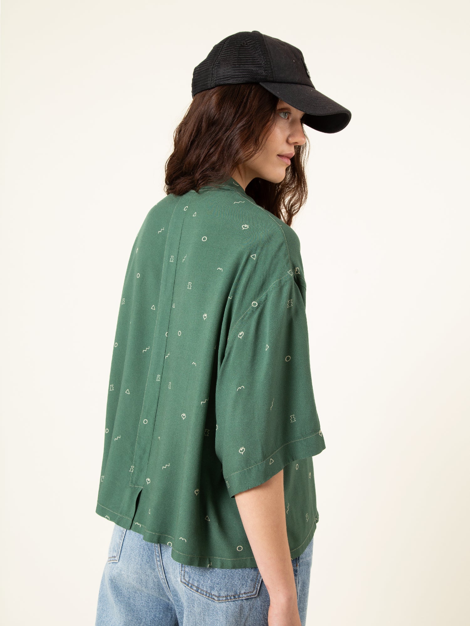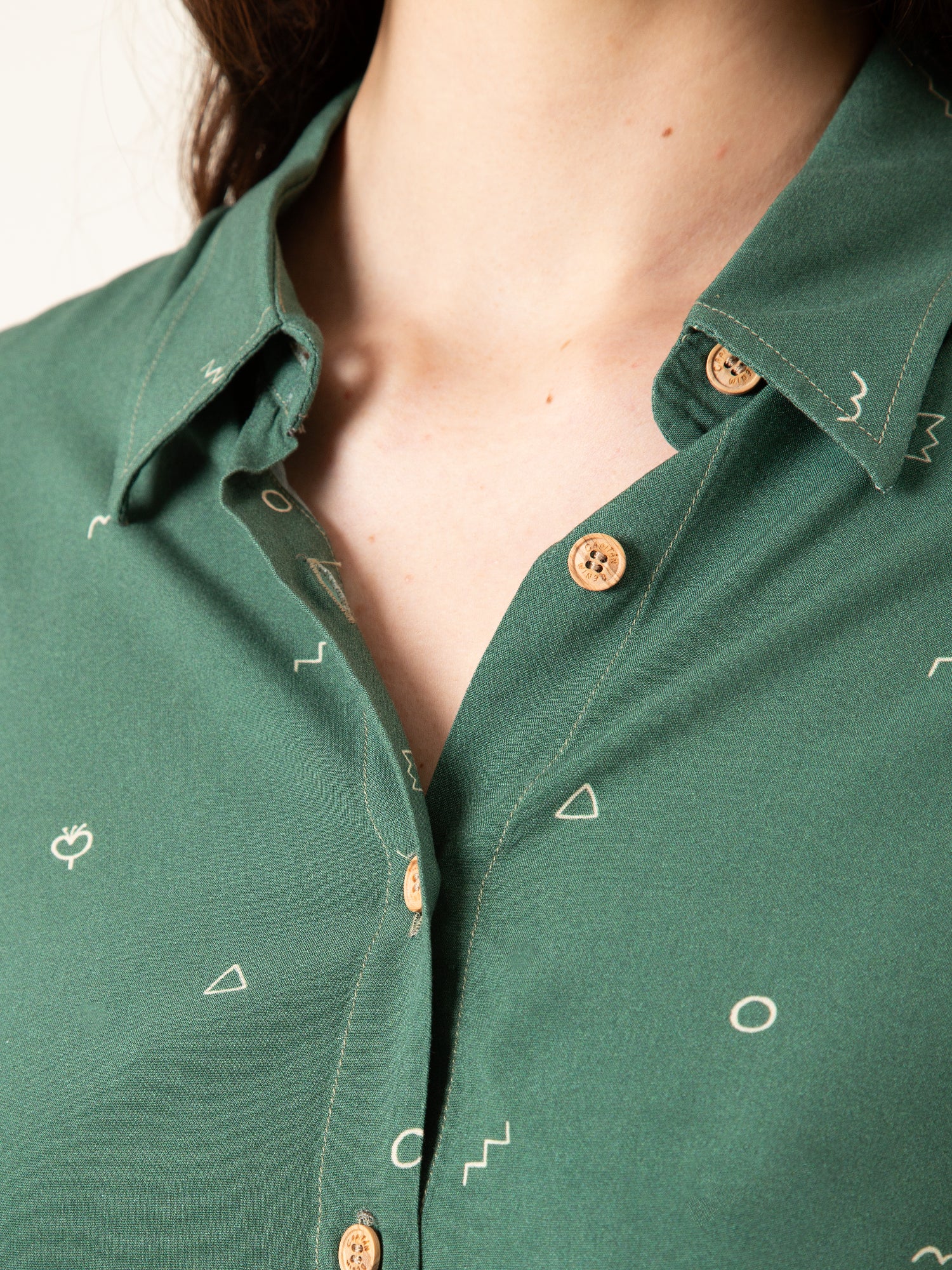 La Camisa Paz Verde es una prenda fresca y delicada, pensada para acompañar los días de verano con un estilo relajado y natural. Su base en verde profundo, combinada con un micro estampado sutil, aporta un aire limpio, moderno y fácil de combinar.