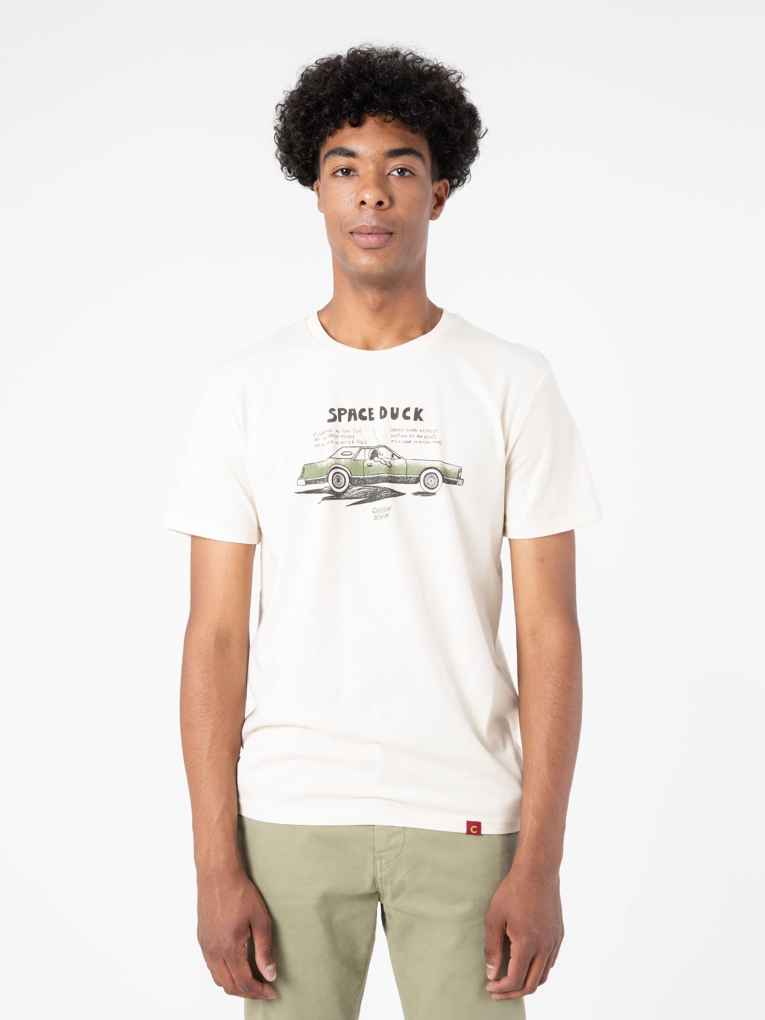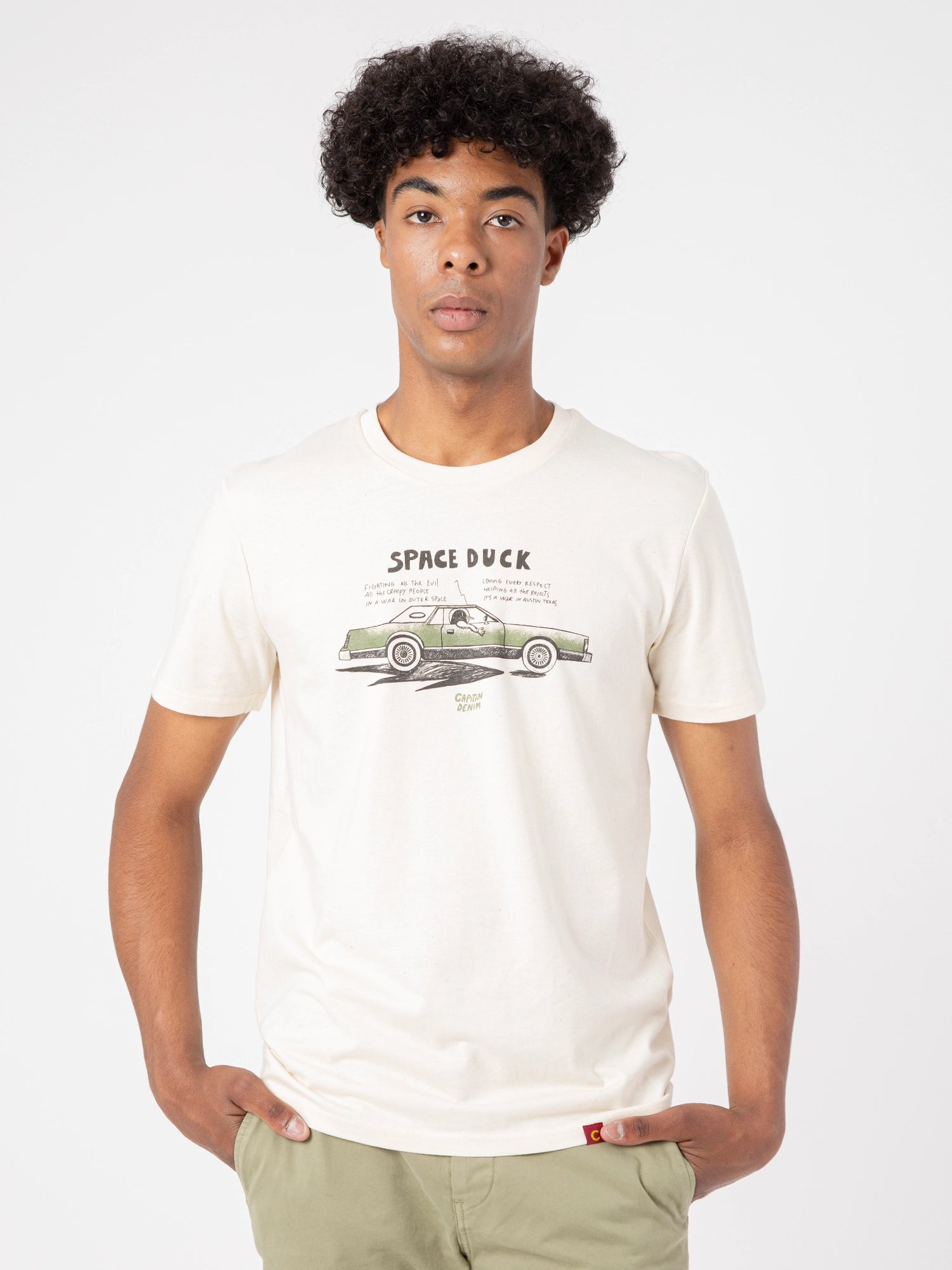 La camiseta space duck es unisex de algodón orgánico. Es de manga corta y es perfecta para cualquier ocasión. Está diseñada por ilustradores locales, por lo que es una prenda exclusiva de Capitán Denim.