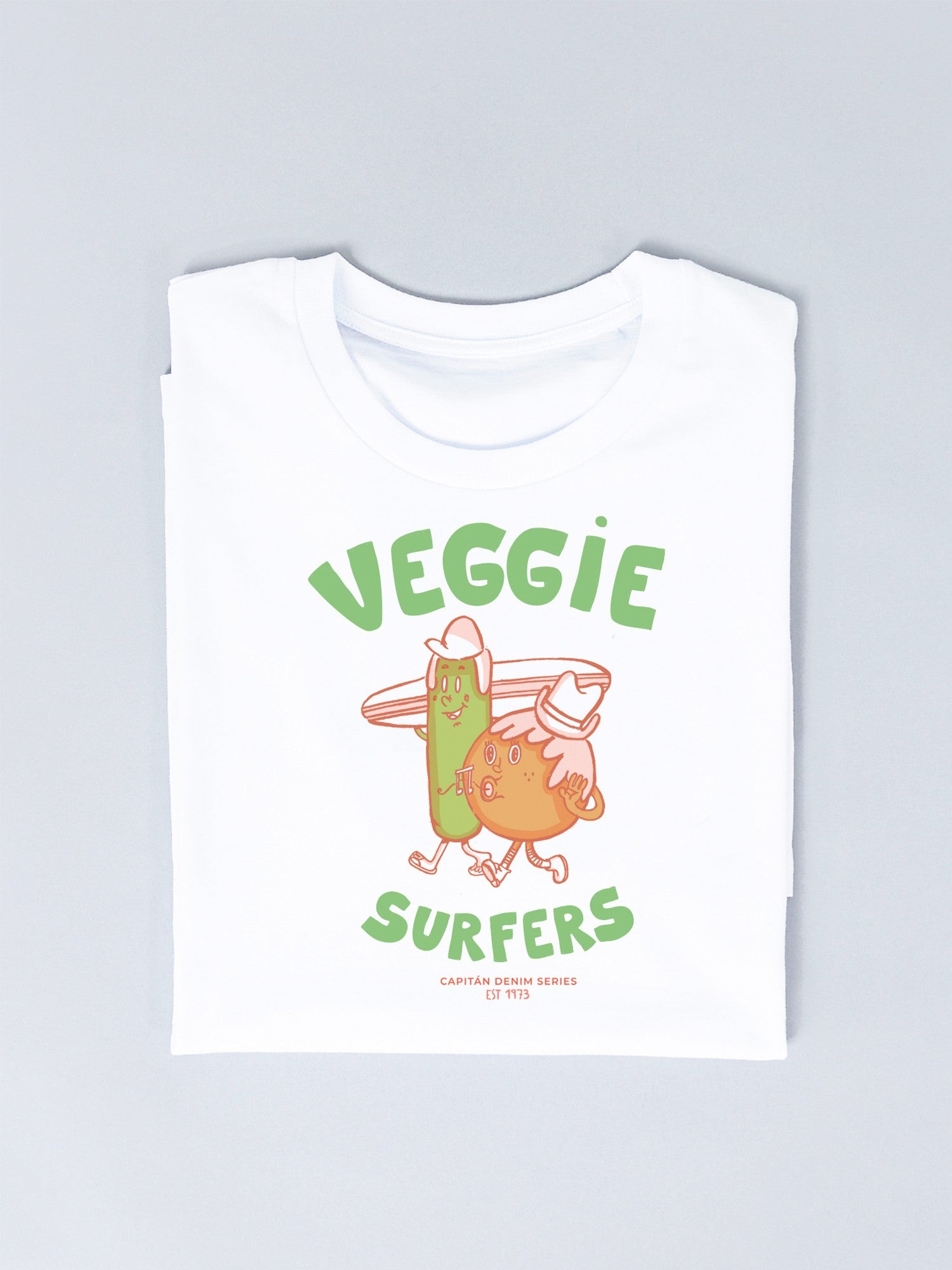 Camiseta unisex de manga corta fabricada de manera sostenible y compuesta de algodón orgánico. ¿Alguna vez habías visto una naranja y un pepino surfeando? ¡En Capitán Denim! Este nuevo diseño para verano es perfecto para regalar a tus amigos más veggie. Es unisex, de manga corta y está elaborada con algodón orgánico. Una prenda sostenible para sacarle una sonrisa a cualquiera.