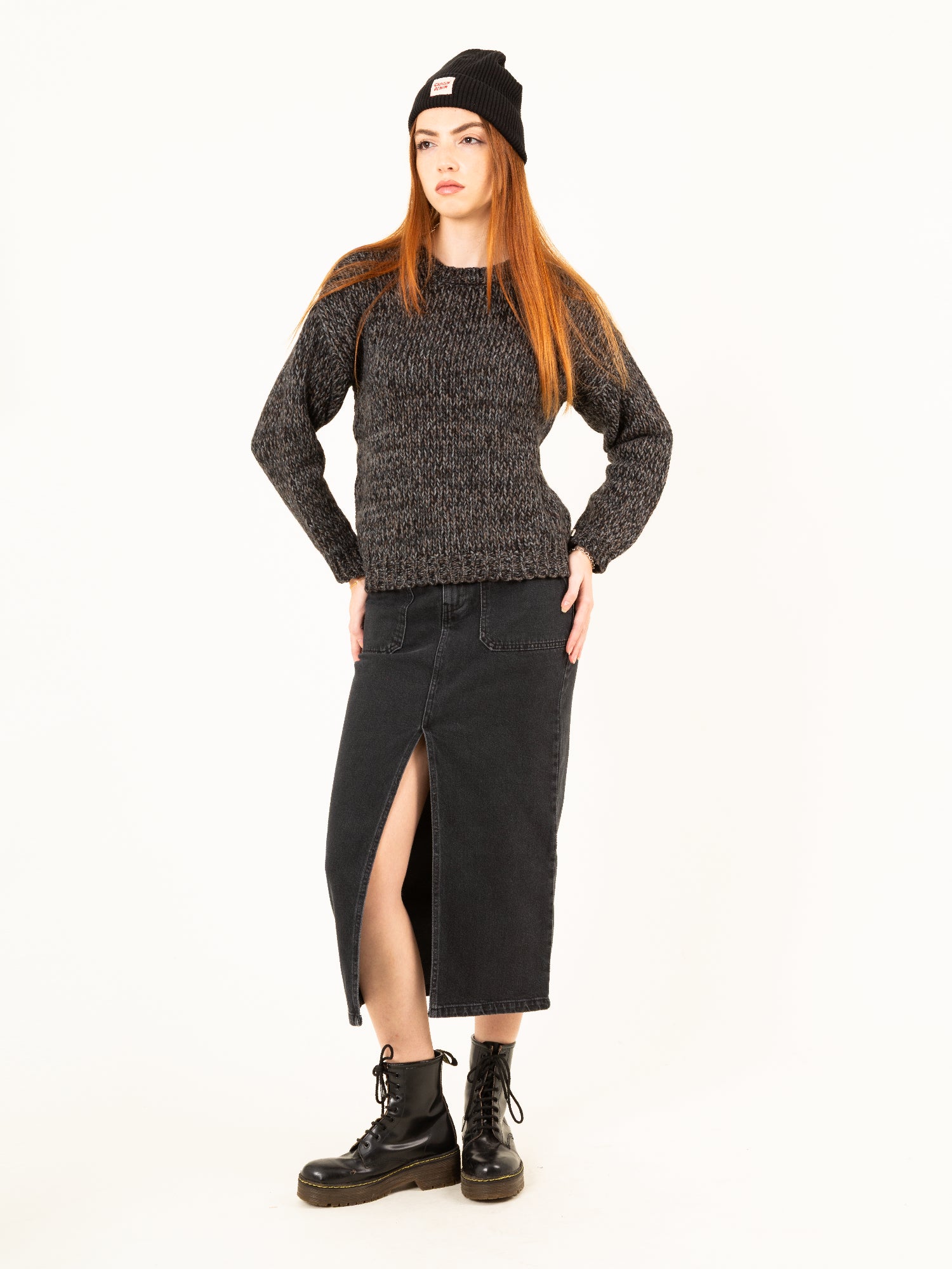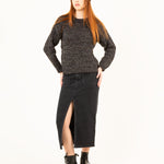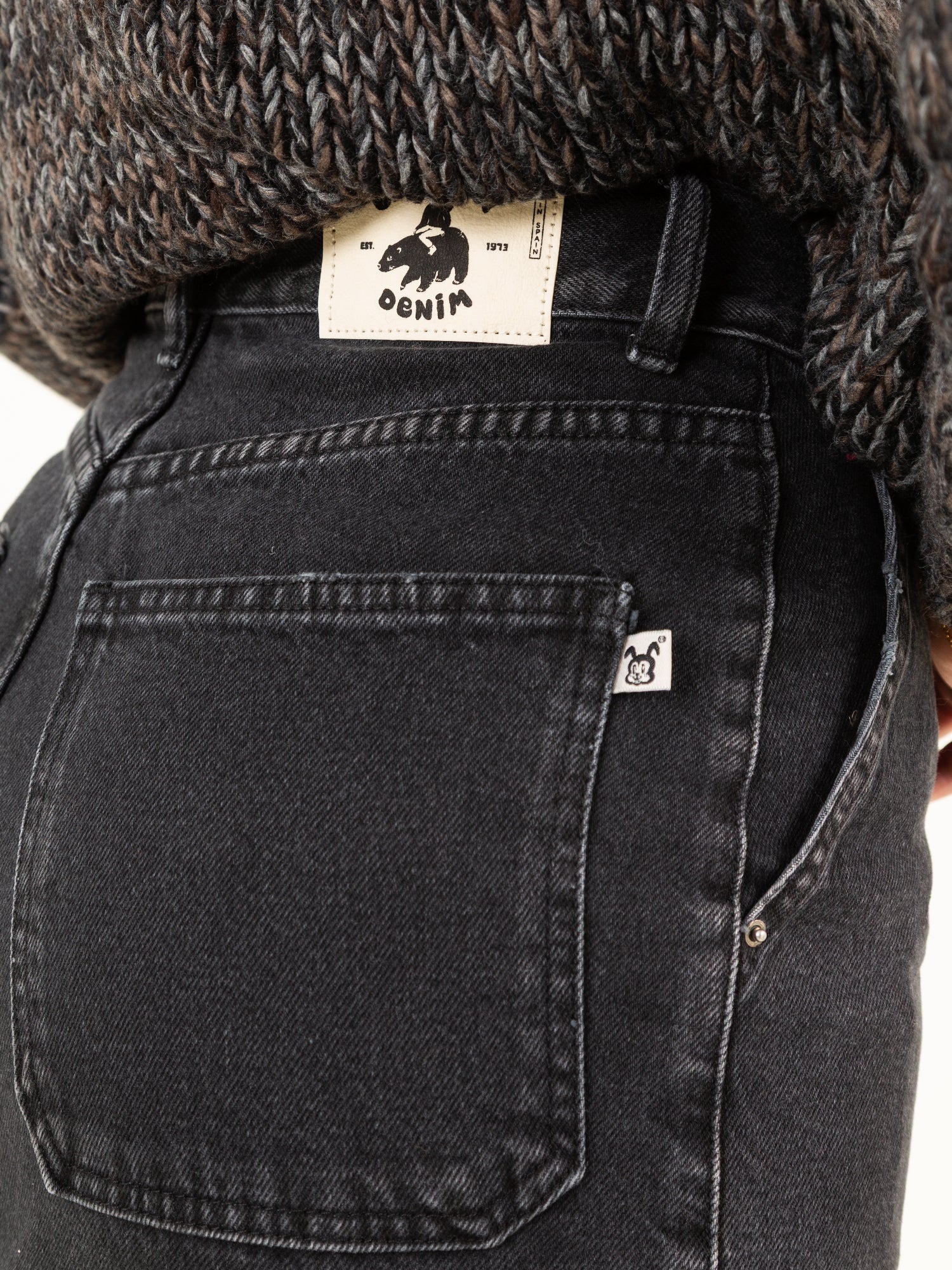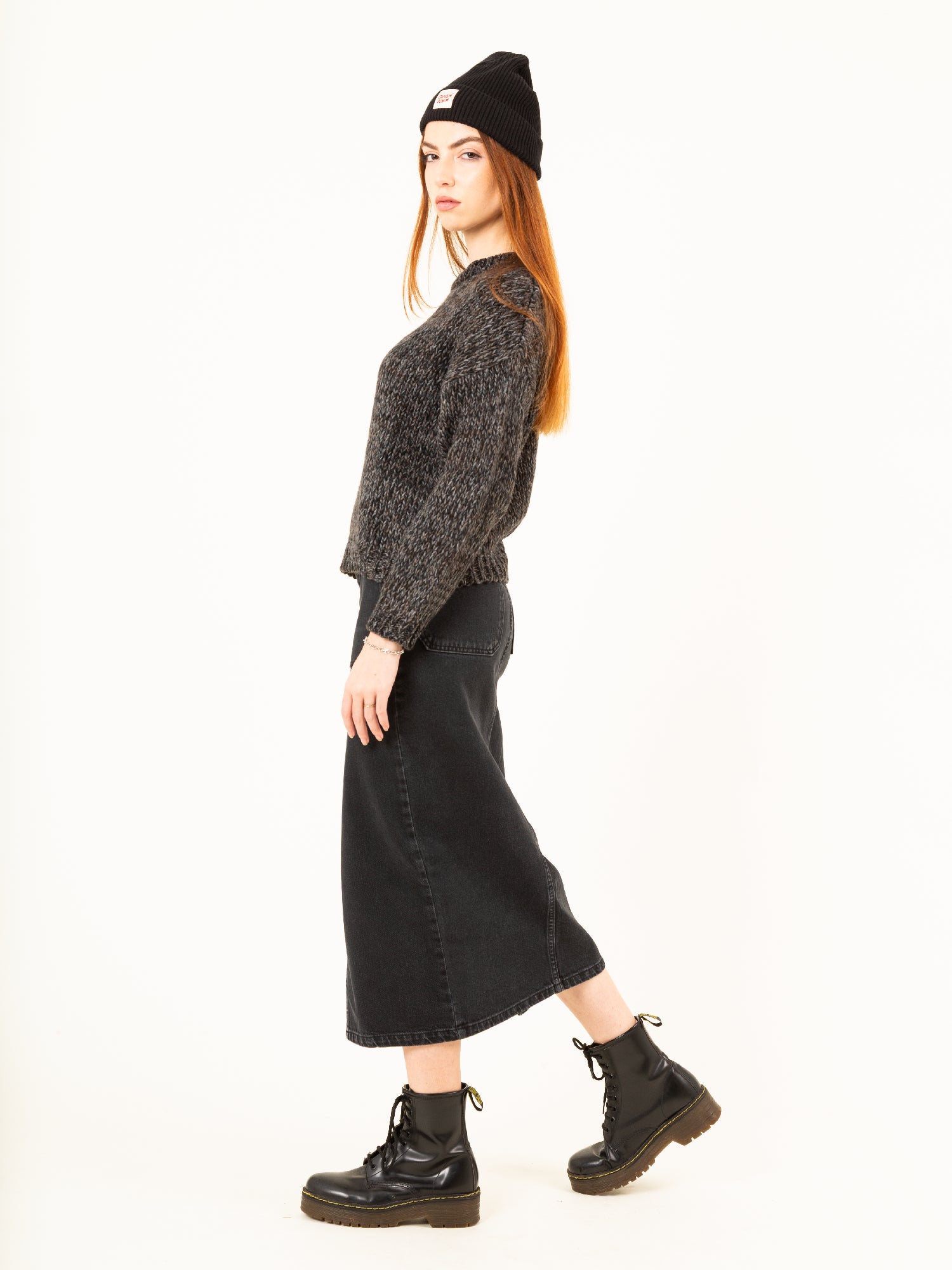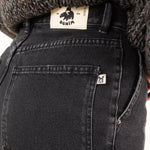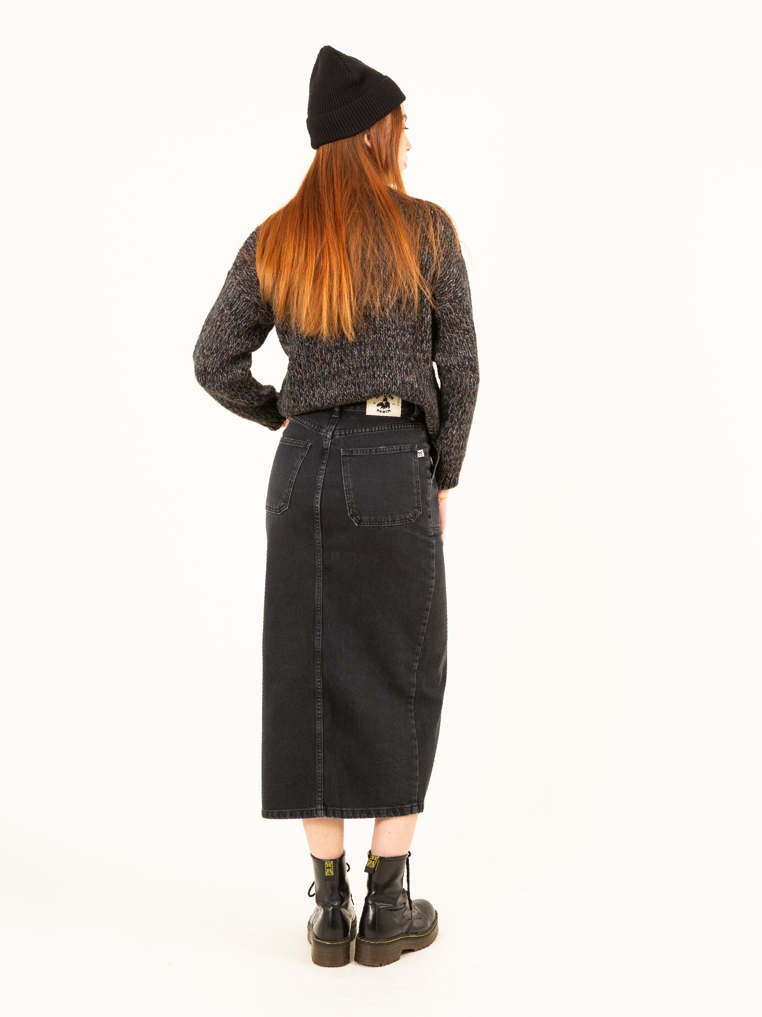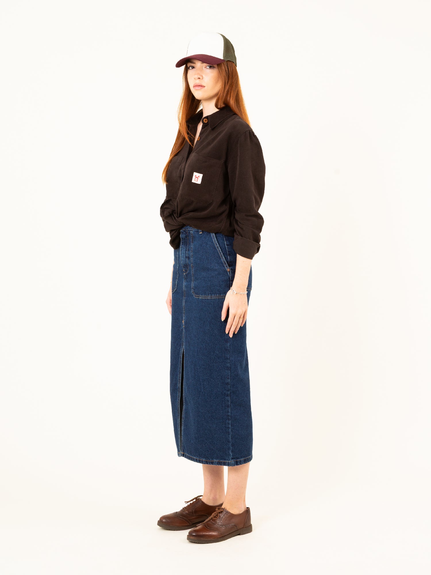 Maki Vintage Blue es la falda vaquera con más personalidad de la temporada. Con su abertura frontal y su tono negro, evoca el espíritu noventero del denim original.