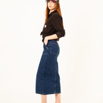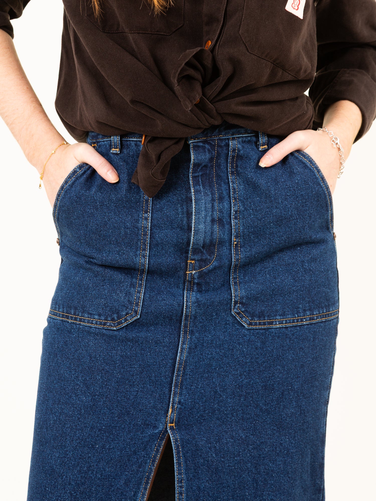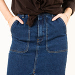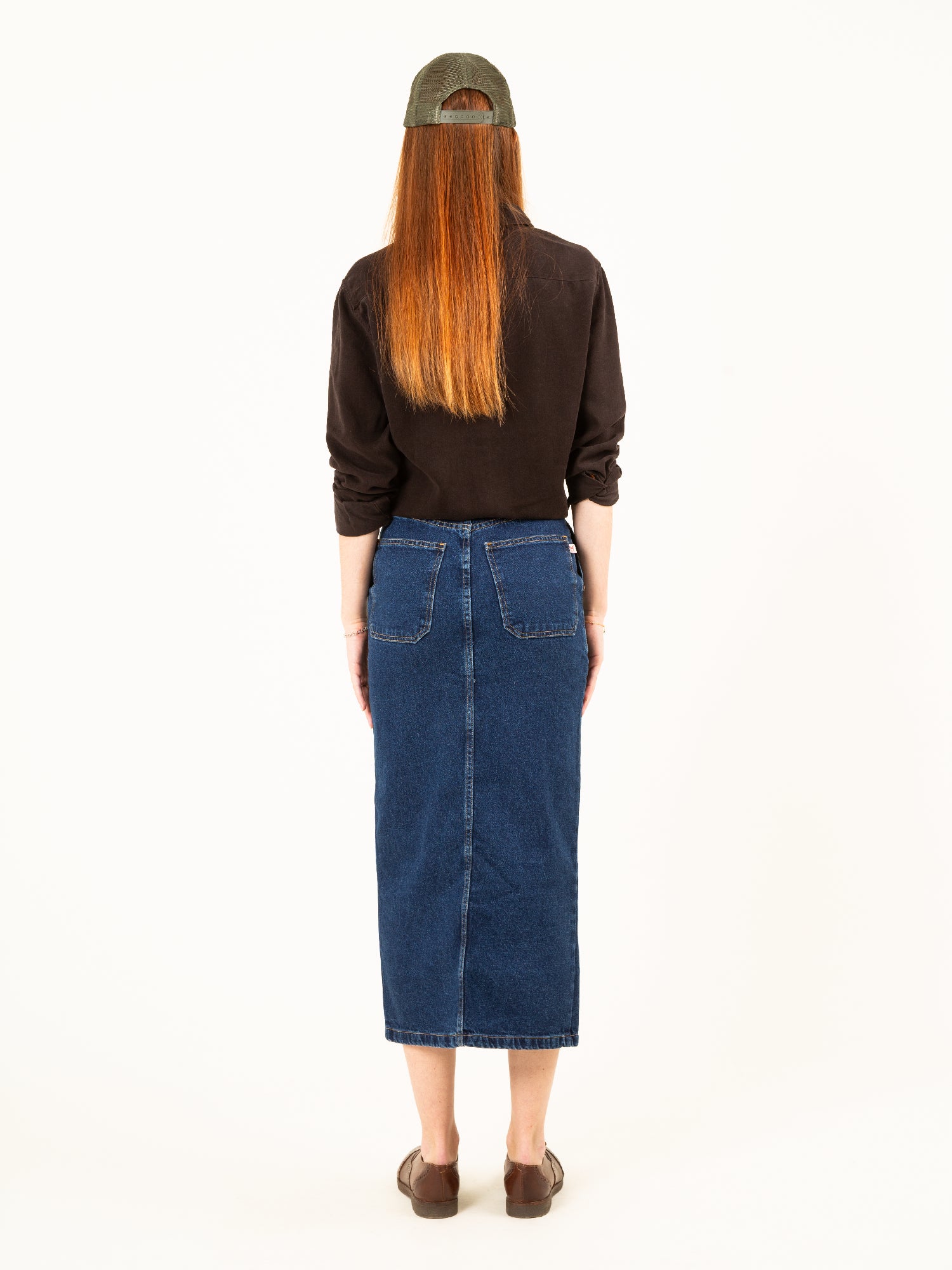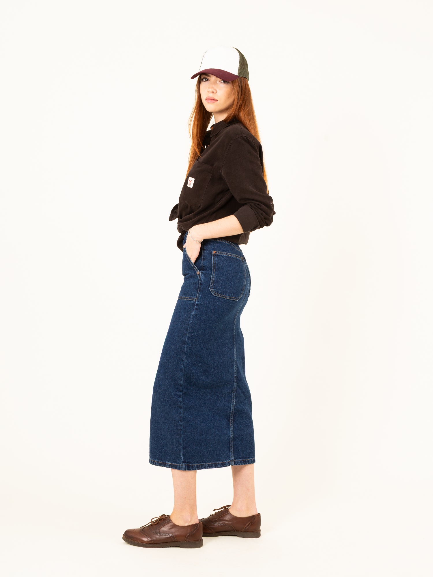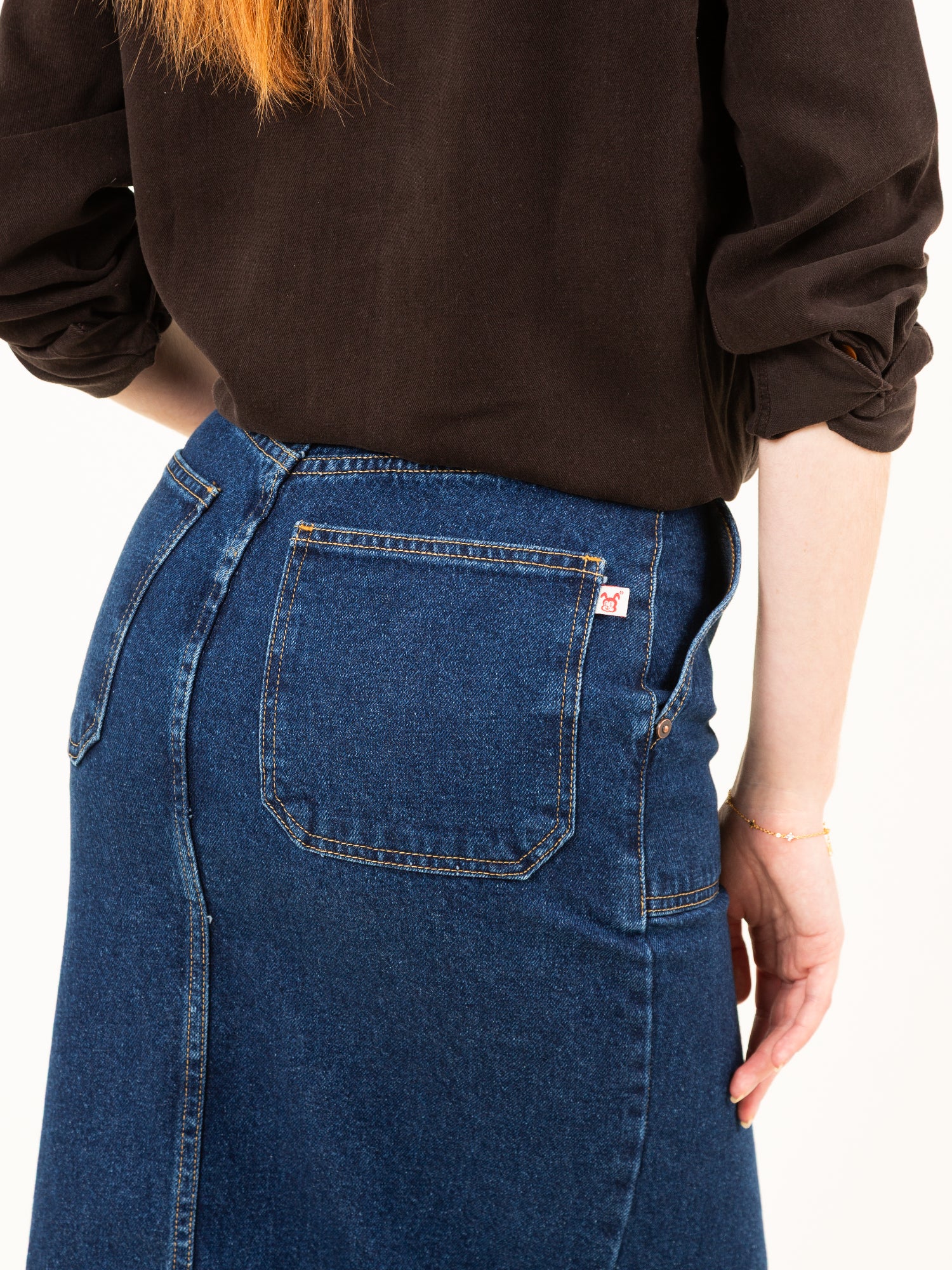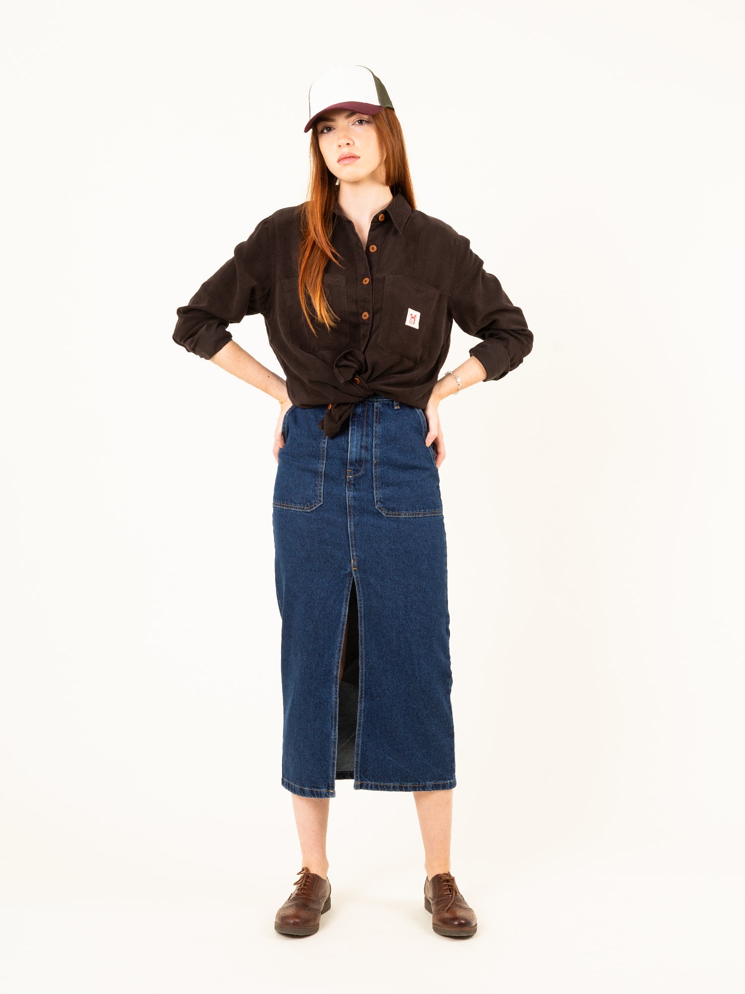 Maki Dark Blue es una falda vaquera midi con abertura central que combina estilo retro y comodidad contemporánea. Inspirada en los años 90, vuelve en su versión más actual y sostenible.