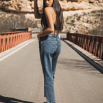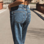 Tulsa Dark Blue son unos jeans momfit de mujer con tiro medio y cintura relajada. Su tono dark blue y cinco bolsillos los convierten en un básico imprescindible, muy cómodos y versátiles. Están diseñados y fabricados íntegramente en España bajo la producción local. Edición limitada y best seller.