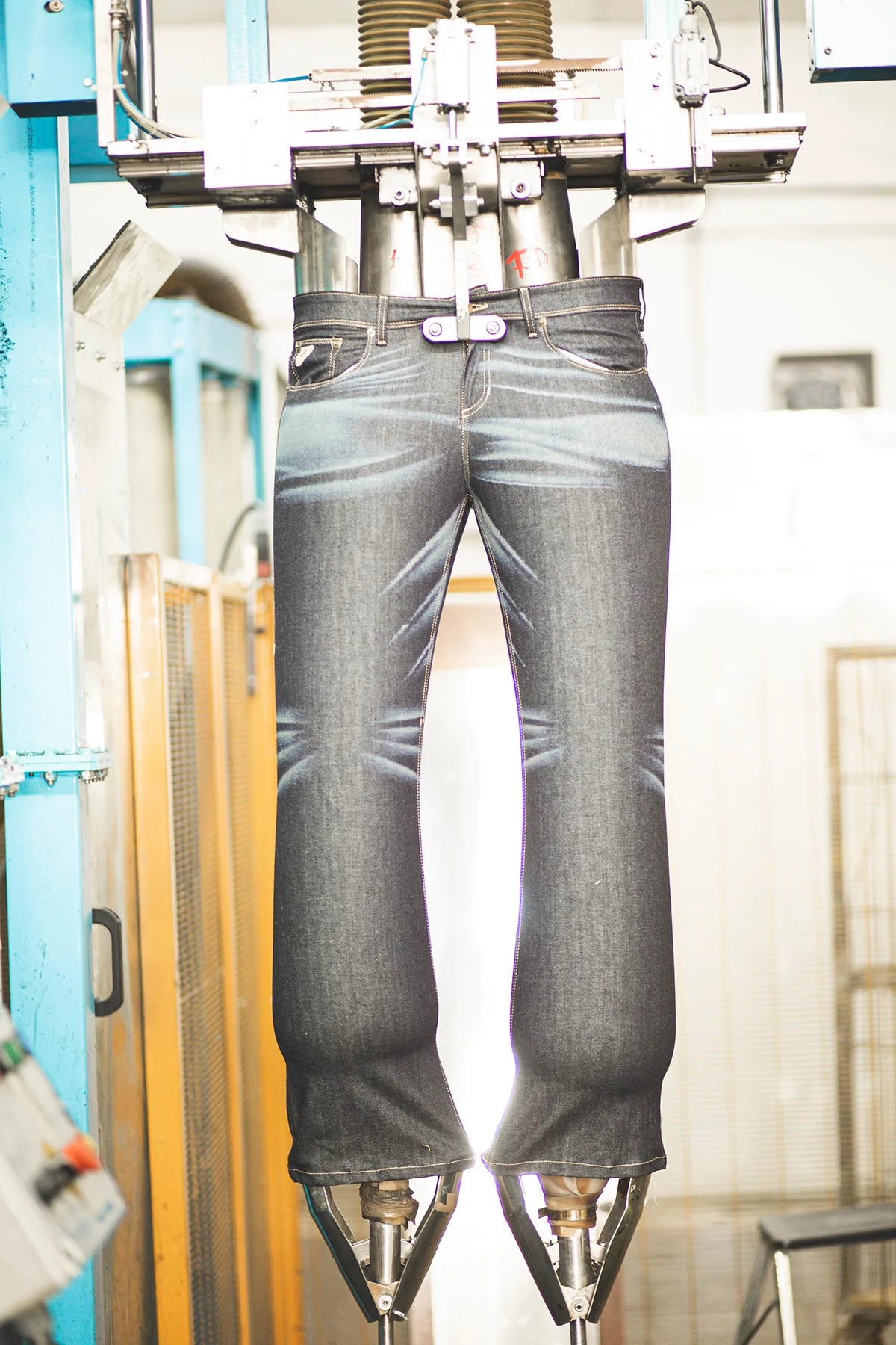 Una vez que se ha confeccionado la prenda, es el momento de la tintura ya que, dependiendo del tejido, hay pantalones que se cosen en color crudo. Para llevar a cabo este proceso de manera tradicional, el agua es el vehículo de transmisión principal donde se mezcla con el tinte y se bañan las prendas hasta conseguir el color deseado. De hecho, para poder tintar 1kg de pantalones, se necesitan 12 litros de agua. Con la tecnología de Nebulización o Eco Finish, sustituimos el agua por el aire, de manera que el tinte se va impregnando uniformemente en el pantalón. Así, tan solo necesitamos 1 litro de agua para 1kg de jeans.